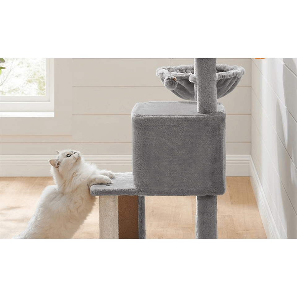 - Arbre à chat avec planche à gratter, grotte, plate-formes en forme de marche, hamac et des poteaux enveloppés de sisal