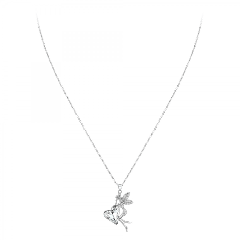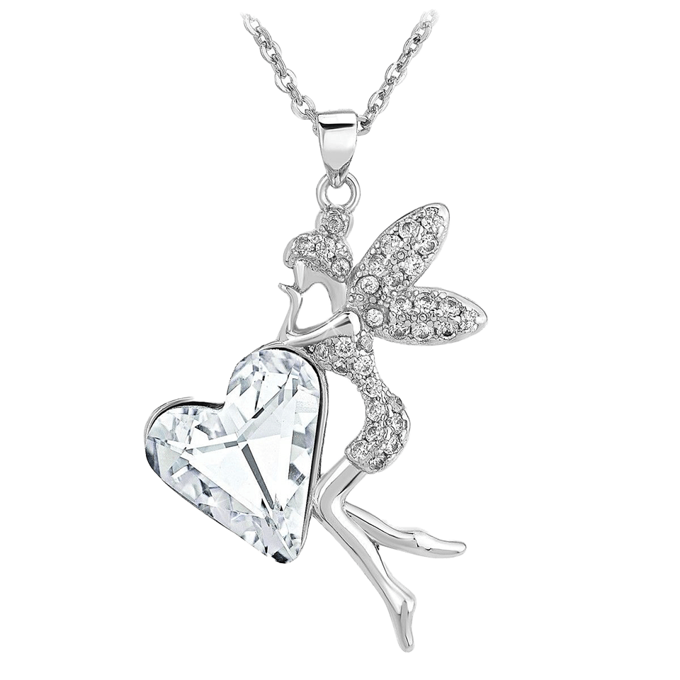 Son pendentif, mêlant une délicate silhouette de fée et un cœur lumineux, semble tout droit sorti d’un conte moderne.