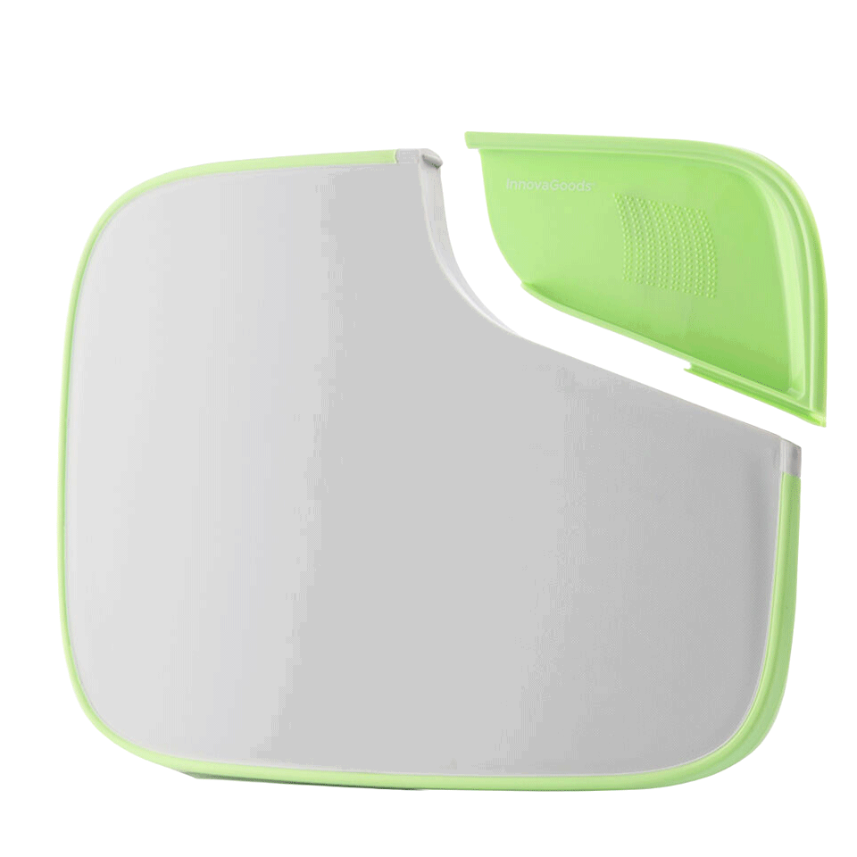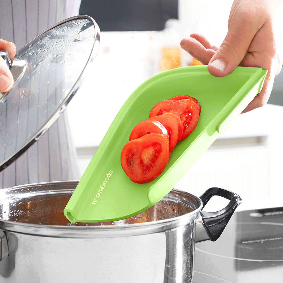 Une fois détachée, elle devient un plateau idéal pour recueillir légumes, fruits ou fromages coupés ou râpés, afin de les verser directement dans une casserole ou une poêle sans gaspillage.