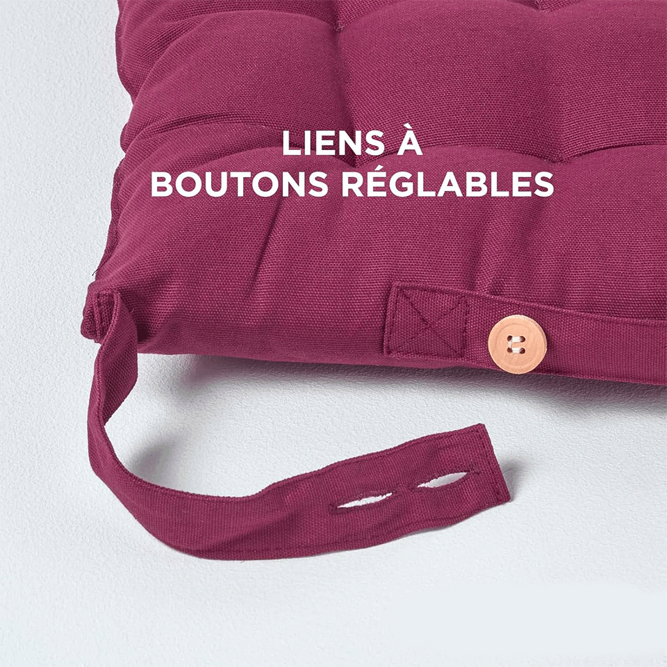 Fixation pratique et élégante. Attaches à bouton solides pour un maintien parfait sur la chaise – fini les nœuds qui se défont ou les coussins qui glissent !